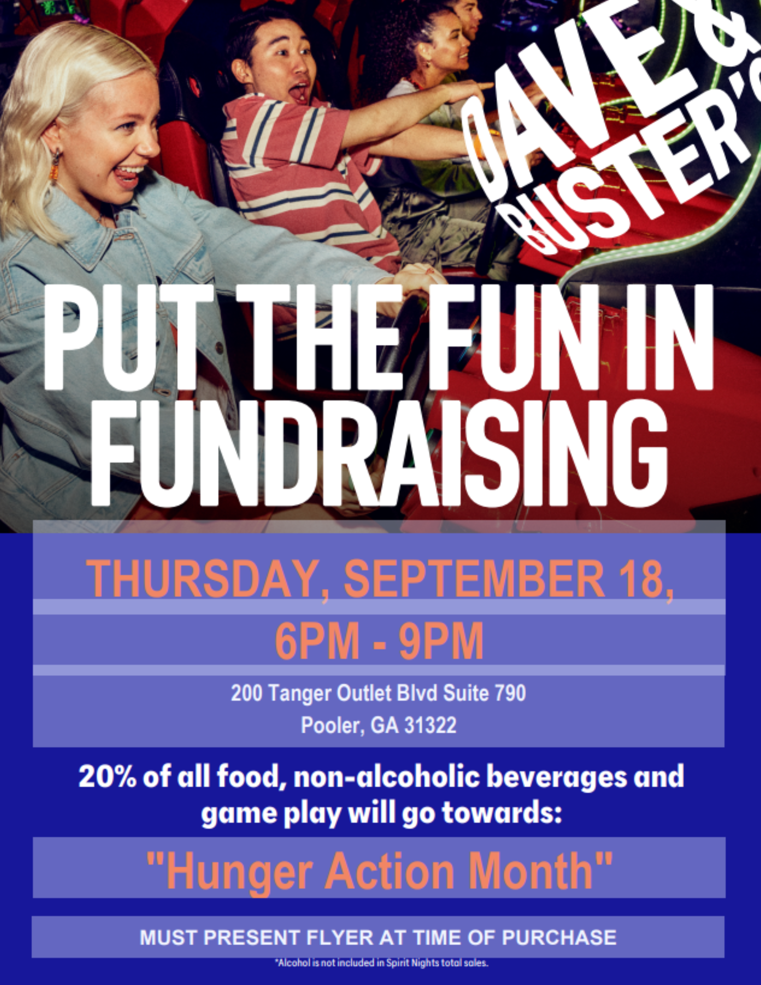 20% of all food, non-alcoholic beverages and game play will benefit Hunger Action Month.